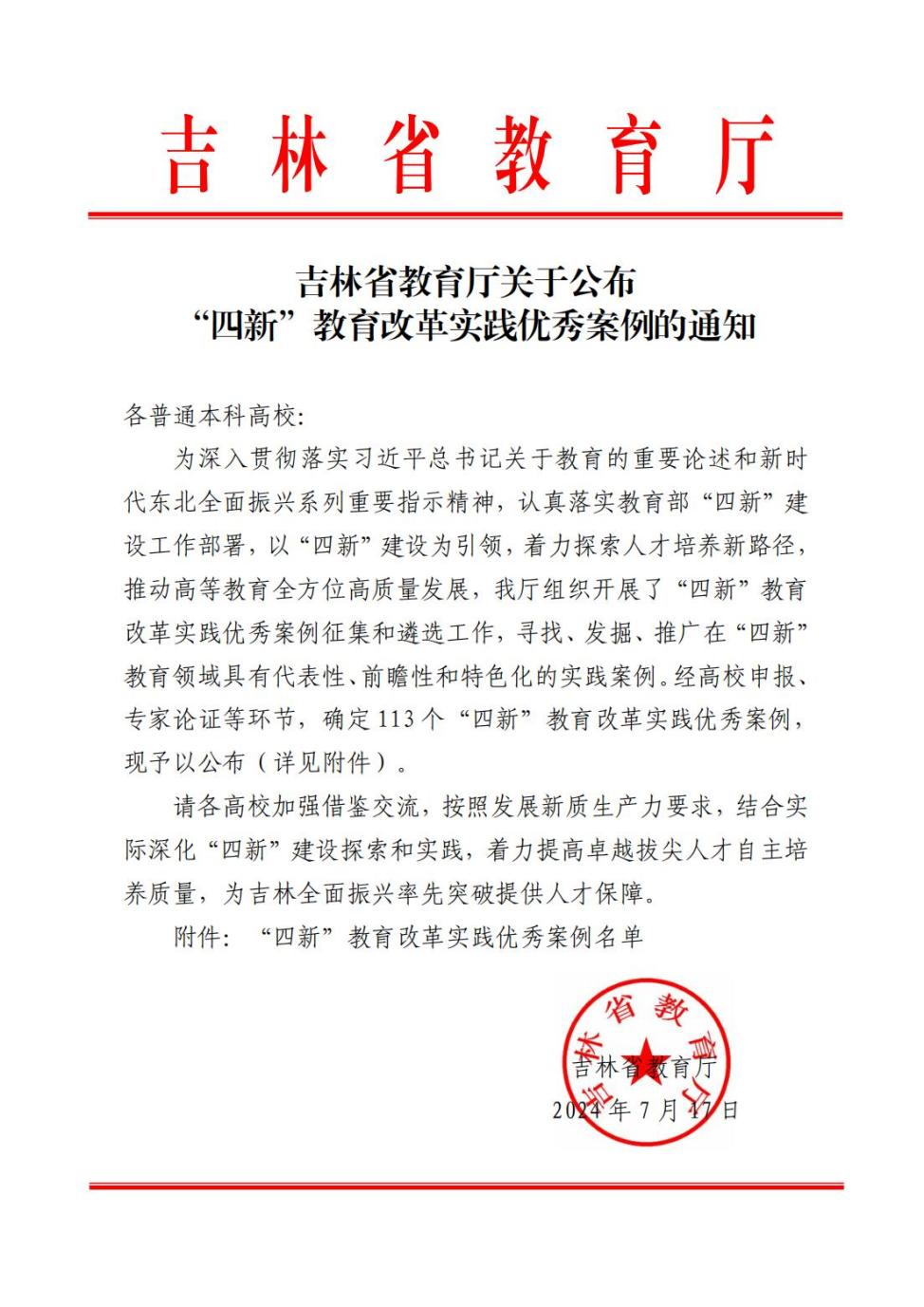 近日,吉林省教育厅印发了《吉林省教育厅mk体育在线登录入口china官方网站公布“四新”教育改革实践优秀案例的通知》,我校5个案例入选“四新”教育改革实践优秀案例。