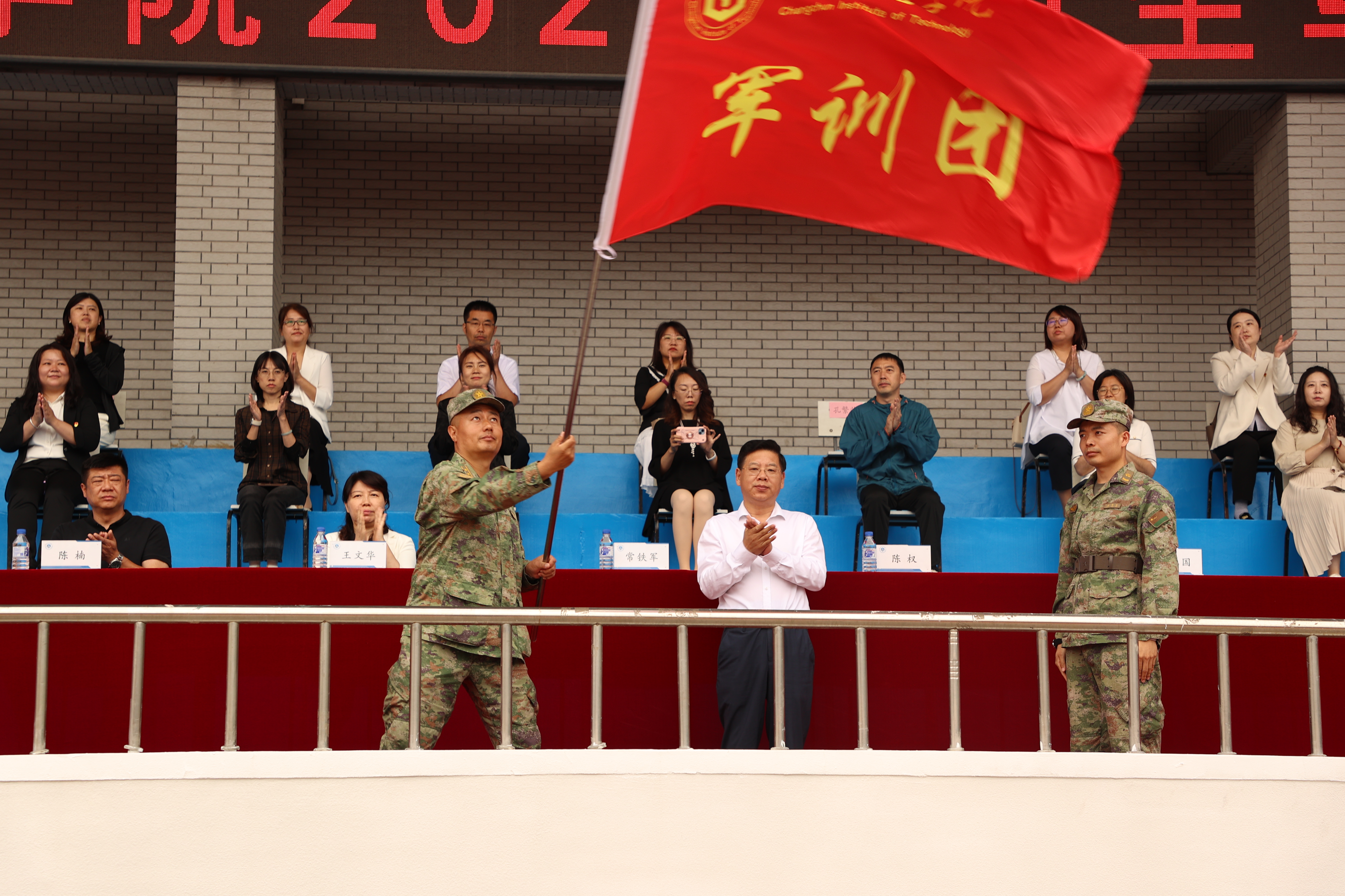 在仪式上,陈权书记为军训团授团旗。军训团团长常铁军中校为各军训营授营旗。