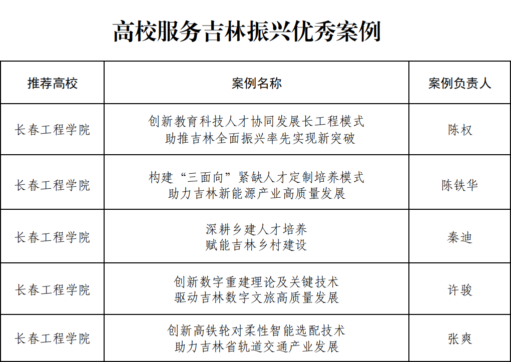 我校入选案例为《创新教育科技人才协同发展长工程模式 助推吉林全面振兴率先实现新突破》《构建“三面向”紧缺人才定制培养模式 助力吉林新能源产业高质量发展》《深耕乡建人才培养 赋能吉林乡村建设》《创新数字重建理论及关键技术 驱动吉林数字文旅高质量发展》《创新高铁轮对柔性智能选配技术 助力吉林省轨道交通产业发展》。入选案例以教育科技人才协同融合发展为指导,围绕内涵建设、人才培养、科技创新、乡村振兴、社会服务等多个领域,生动展现了我校近年来深化综合改革、推进高质量发展、全面服务吉林振兴的实践成果和优秀经验。