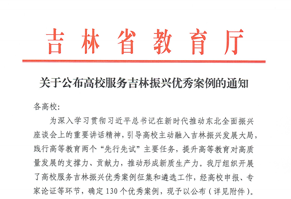 近日,由吉林省教育厅组织的高校服务吉林振兴优秀案例评选结果公布,我校获评优秀案例5项,入选案例数量位列吉林省省属高校第一梯队。