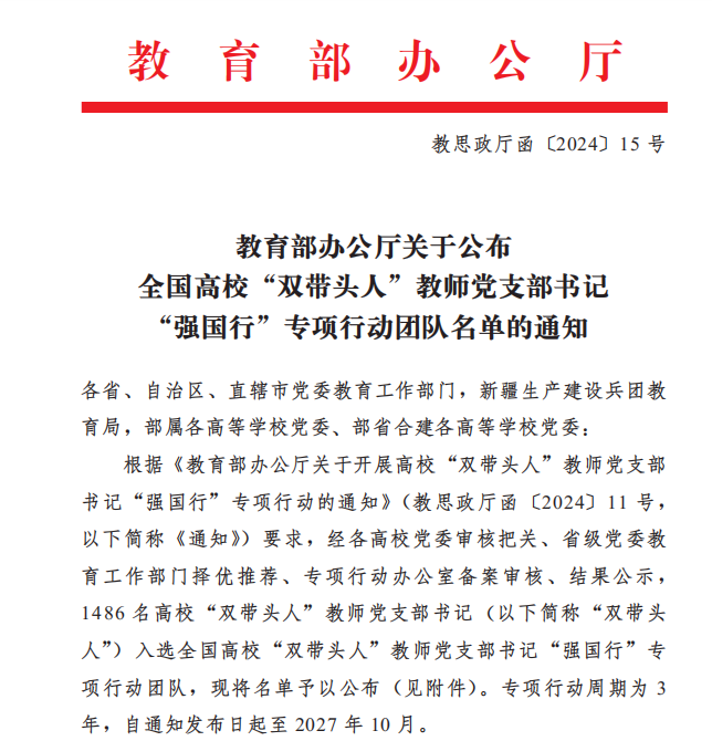 近日,教育部公布全国高校“双带头人”教师党支部书记“强国行”专项行动团队名单,我校水利工程学院水利与水电教师党支部成功入选。