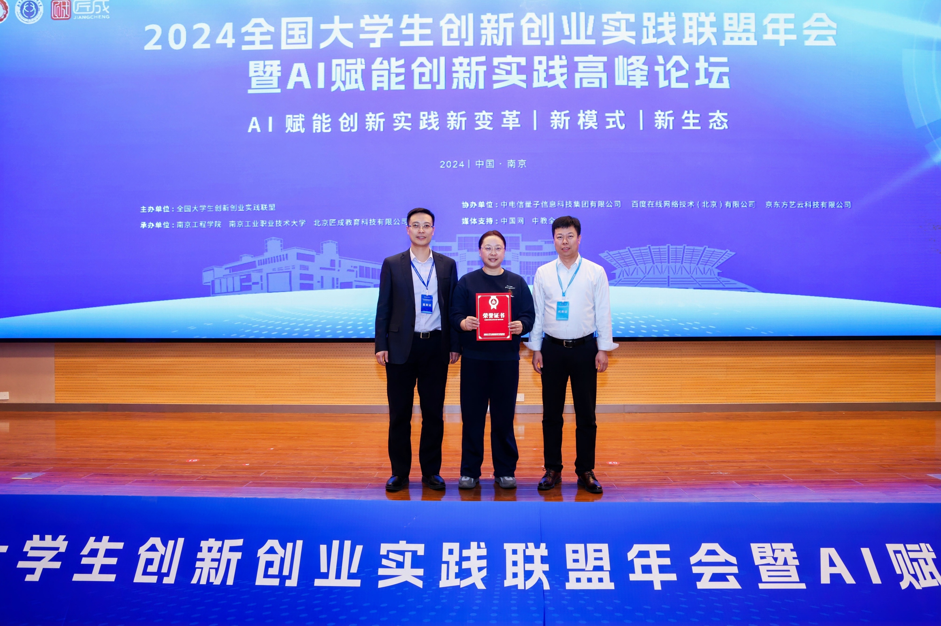 12月27日至29日,全国大学生创新创业实践联盟(以下简称“实盟”)2024年年会暨AI赋能创新实践高峰论坛在南京工程学院召开。我校大学生创新创业教育学院院长郭瑞受邀出席会议,并以《数智技术赋能大学生创新教育的管理与实践》为题作报告。我校土木工程学院大学生创新实践中心主任李延君老师撰写的论文荣获本届年会优秀论文三等奖,被授予“指导教师优秀事迹”荣誉称号。