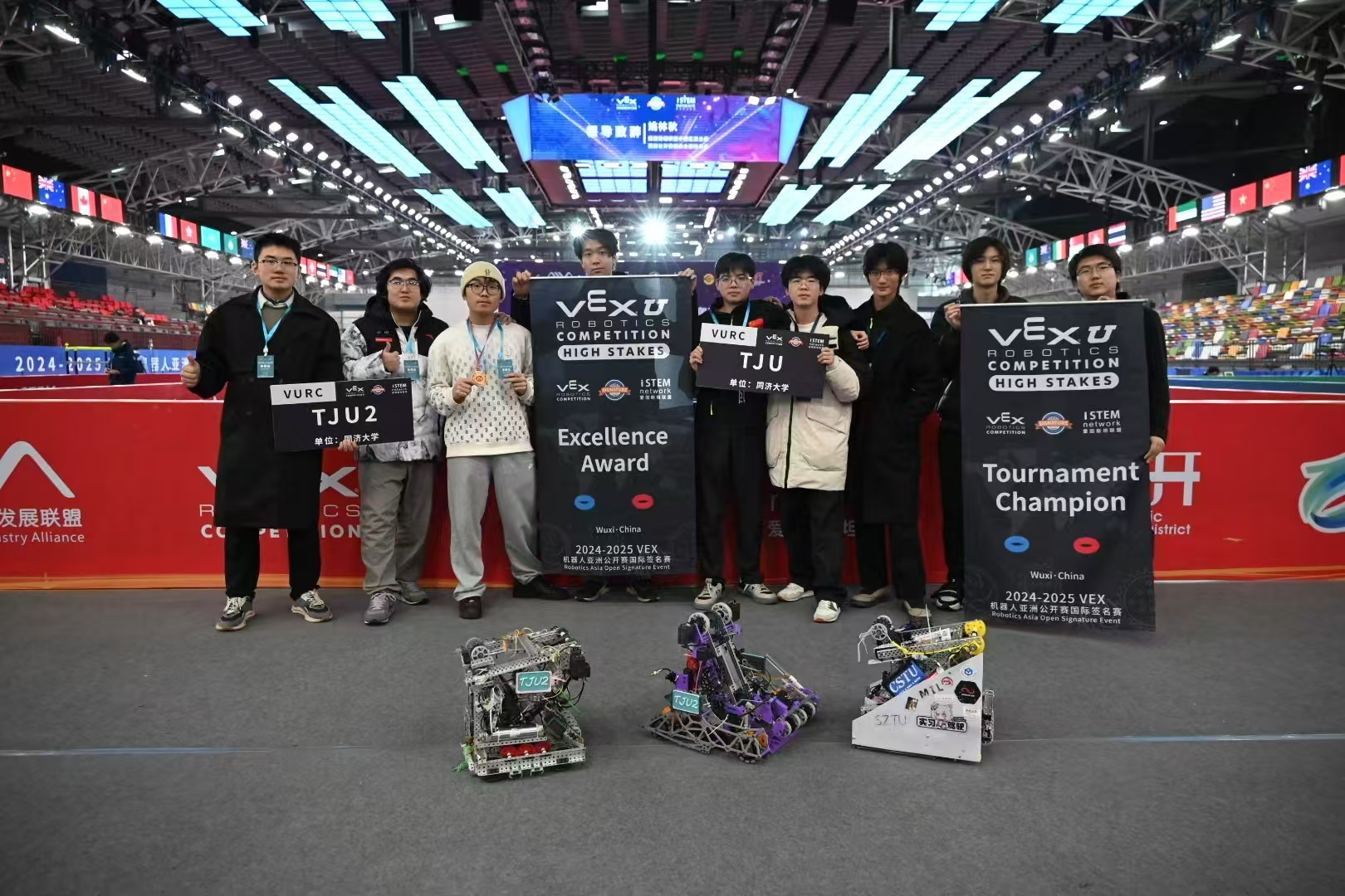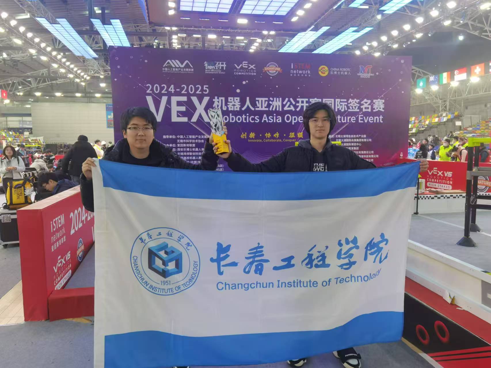 2024年12月30日,2024-2025赛季VEX机器人亚洲公开赛国际签名赛在无锡太湖国际博览中心盛大开幕。大赛汇聚了21个国家及地区的近500支优秀赛队,共计2000余名参赛选手参赛,经过三天的激烈角逐,我校VEX U赛队喜获VEX机器人亚洲公开赛国际签名赛大学组总冠军,创历史最佳成绩。