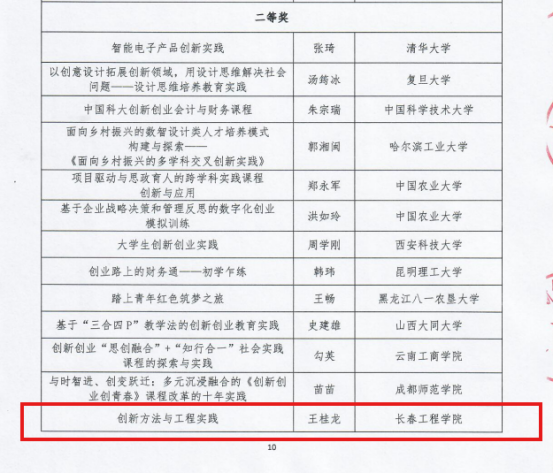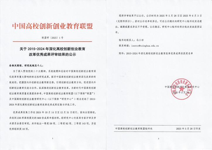 近日,中国高校创新创业教育联盟公示了2015-2024年深化高校创新创业教育改革优秀成果评审结果,我校教师获得“优秀课程”与“优秀论文”两项二等奖。