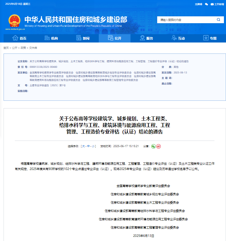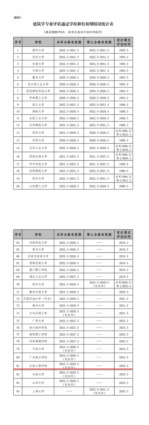近日,住房和城乡建设部发布《mk体育在线登录入口china官方网站公布高等mk体育在线登录入口china官方网站建筑学、城乡规划、土木工程类、给排水科学与工程、建筑环境与能源应用工程、工程管理、工程造价专业评估(认证)结论的通告》(土建专业评估通告〔2025〕第1号),我校建筑学专业和工程造价专业通过评估(认证),合格有效期均为4年,自2025年5月起至2029年5月止。