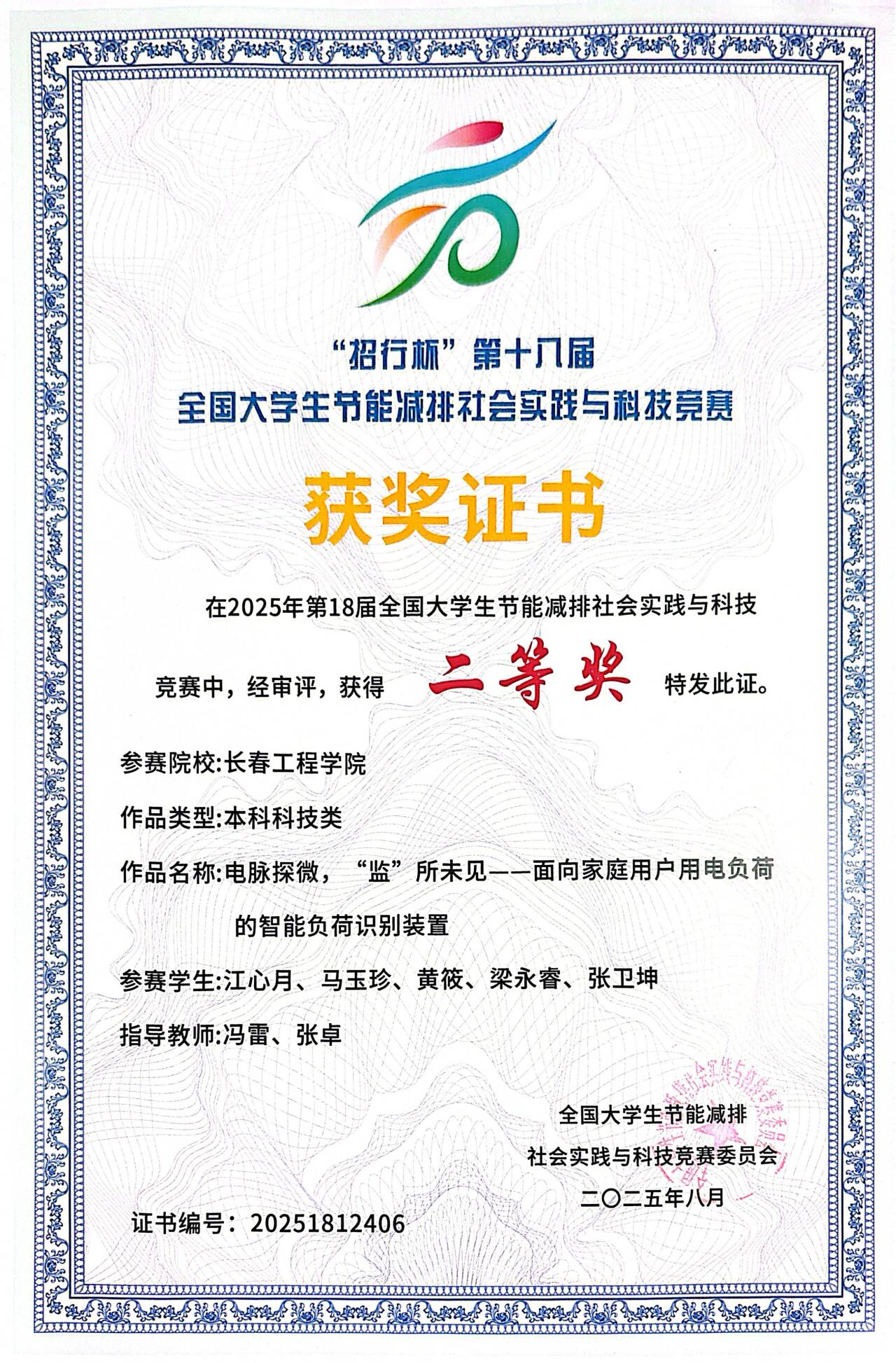 近日,2025年“招行杯”第十八届全国大学生节能减排社会实践与科技竞赛决赛在东北石油大学落幕。由我校电气与信息工程学院冯雷、张卓老师共同指导的题为“电脉探微,监所未见—面向家庭用户用电负荷的智能负荷识别装置”项目荣获全国二等奖,我校荣获优秀组织奖。
