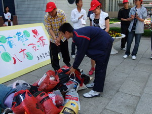 5月26日,由土木学院分团委社会实践部及阳光青年志愿者协会联合组织的抗震救灾捐款捐物活动,于中午12点在西区图书馆门口举行。