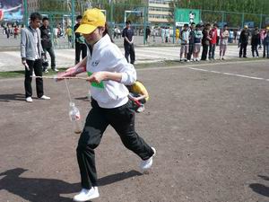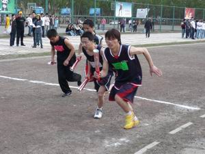 此次接力赛各年级分别派出两支由10人组成的参赛队,分为男子800米、吊矿泉水瓶跑50米、指定位置踢毽子60个、奥运知识问答、三人四足跑50米、羽毛球拍托网球跑50米、拍篮球跑50米和冲刺跑500米八个接力项目。其中羽毛球拍托网球跑50米由各年级的辅导员参加。比赛过程激烈而有趣,加油声、呐喊声此起彼伏,师生同乐,趣味无穷。最终,07级甲组参赛队以优异成绩获得冠军。