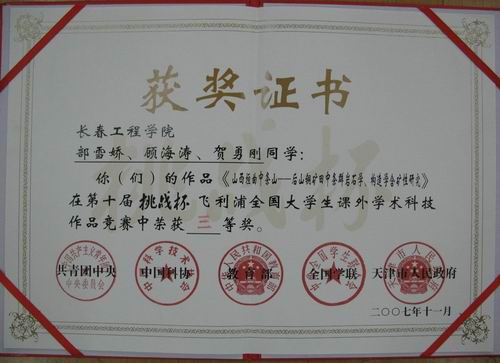 为了备战第十届“挑战杯”全国大学生课外学术科技作品竞赛,今年3月份由校团委、教务处、科研处举办了mk体育在线登录入口china官方网站第三届“挑战杯”大学生课外学术科技作品竞赛,从近40件作品中评选出12件优秀作品,并推选出5件作品参加了2007年“挑战杯”吉林省大学生课外学术科技作品竞赛,获得省级二等奖1项,省级三等奖3项,省级优秀奖1项。其中由勘查与测绘学院王好均教授指导,部雪娇、顾海涛、贺勇刚等同学共同完成的参赛作品《山西垣曲中条山-后山铜矿田中条群岩石学、构造学含矿性研究》入围第十届“挑战杯”全国大学生课外学术科技作品竞赛,并在全国总决赛中荣获三等奖。