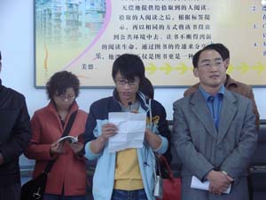 副院长任玉珊教授代表学院领导讲话,他希望同学们能通过图书漂流活动,学会阅读,学会学习,养成诚信的良好品质。并衷心祝愿同学们身体健康,生活快乐,学习进步!衷心祝愿缕缕书香飘遍mk体育在线登录入口china官方网站校园的每一个角落!