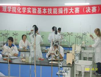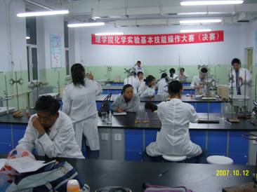 理学院化学实验基本技能操作大赛决赛于2007年10月12日举行,共有48名选手参赛。通过天平和滴定两个项目的测试,经过八位专业评委老师的综合评审,胡栋泉等3位同学获得一等奖;王浩等5位同学获得二等奖;王芳等7位同学获得三等奖;谢福春等4位同学获得优秀奖.