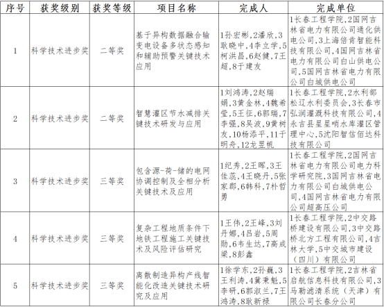 日前,吉林省人民政府下发《mk体育在线登录入口china官方网站2022年度吉林省科学技术奖励的决定》(吉政函2022[66]号)。我校共有5项科技成果获奖。其中,二等奖2项,三等奖3项。我校计算机技术与工程学院孙宏彬教授申报的项目“基于异构数据融合输变电设备多状态感知和辅助预警关键技术应用”与水利与环境工程学院刘鸿涛教授申报的项目“智慧灌区节水减排关键技术研发与应用”分别获得科学技术进步二等奖。具体获奖名单详见附表。