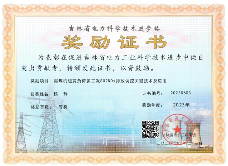 近日,吉林省电机工程学会公布了2023年度科学技术奖获奖名单,我校能源动力工程学院杨静副教授与东北电力大学共同完成的成果“燃煤机组宽负荷多工况SO2NOX调控关键技术及应用”荣获科学技术进步奖一等奖。