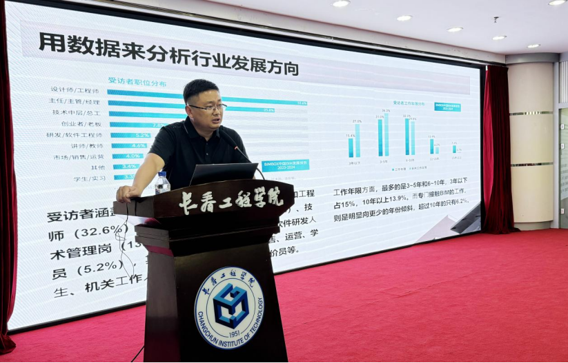 报告会邀请了吉林省吉规城市建筑设计有限责任公司副总建筑师、城乡建设数智所所长刘锡庭担任主讲嘉宾。刘锡庭所长围绕“工程建设领域的数字化技术应用”,详细介绍了当前数字化技术在工程建设领域的应用现状、发展方向以及具体案例。他指出,随着计算机网络、大数据、物联网和人工智能等技术的发展,数字化、信息化、智能化已成为工程建设领域的重要趋势。报告还涉及了BIM技术在工程建设中的应用阶段,以及AI、AIGC、LoT等新兴技术的前景。