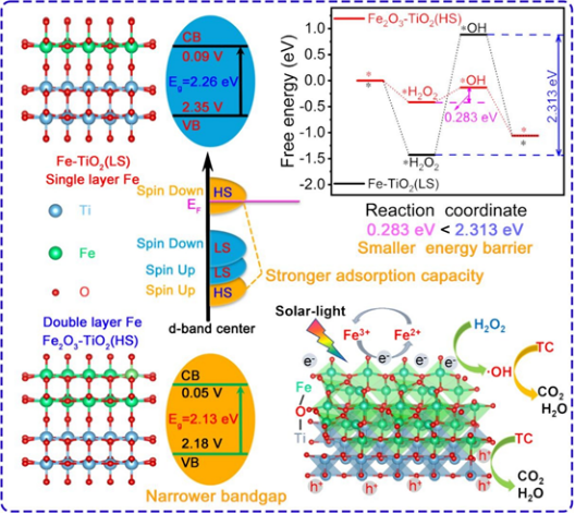 论文针对光芬顿技术处理有机废水过程中Fe(II)再生速度慢、H2O2利用率低等关键问题,将Fe原子锚定在TiO2表面,通过调节Fe的自旋态,制备了一种新型、高效的光芬顿材料,大大提高了有机废水的降解效率。