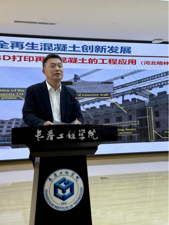 会上,肖建庄教授介绍了全再生混凝土的创新发展过程,从材料匹配、构件匹配、结构体系匹配三个方面详细分析了混凝土结构中的匹配原理,深入探讨了绿色建造技术在未来土木工程发展中的重要性,并着重介绍了再生混凝土的3D打印技术原理,从数据分析、气候变化、安全低碳等方面阐述了建筑固废循环低碳再利用的内涵。