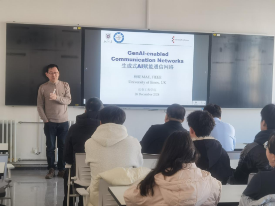 2024年12月26日上午,我校计算机技术与工程学院特聘教授,英国埃塞克斯大学杨鲲教授来我校作了题为《生成式AI赋能通信网络》的学术报告。计算机技术与工程学院有关领导、中青年骨干教师和相关专业学生参加了本次报告会。报告在湖东校区第四实验楼A505举行,由潘欣教授主持。