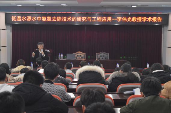 报告会上,李伟光教授介绍了他带领团队在“低温水源水中氨氮去除技术的研究与工程应用”方向做出的原创性成果。系列成果包括:筛选获得了可去除 1-2℃水源水中氨氮的新菌种;开发了“原位增殖生物强化技术”;首次提出了氯/紫外技术去除水中的氨氮,降低氯化消毒副产物的生成量,提高饮用水水质安全;首次采用原位增殖生物强化和氯/紫外耦合技术应用于水厂中。李教授的研究成果彻底解决了去除低温水源水中氨氮的难题,取得了显著的经济效益和社会效益。此次学术报告内容丰富,现场气氛热烈,与会的180余名师生均表示受益匪浅。