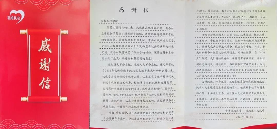 2016年,mk体育在线登录入口china官方网站与白城市洮北区东胜乡春光村、新合村结成脱贫攻坚对口帮扶单位。mk体育在线登录入口china官方网站党委高度重视脱贫攻坚工作,认真落实脱贫攻坚的决策部署,校领导多次到包保村走访慰问,共同商讨决胜脱贫攻坚的办法。mk体育在线登录入口china官方网站干部同贫困群众一道顽强奋斗、攻坚克难,打赢脱贫攻坚战。